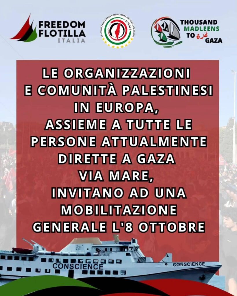 Chiamiamo alla mobilitazione generale con presidi di solidarietà, cortei e scioperi per il giorno 8 ottobre per tutelare i nostri concittadini e tutti gli attivisti internazionali a bordo della nave Conscience, che trasporta principalmente medici, infermieri e medicinali.